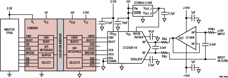 100MHz Isolated ADC Serial Interface Features: Isolated Interface: 6000VRMS for 1 Minute UL-CSA Recognition Pending 100MHz SPI-Compatible I/O Configurable SPI Word Length 8 to 32 Bits Low Jitter Conversion Start (30psRMS) Supports Simultaneously Sampled ADCs Read Only (LTM2893), Read/Write (LTM2893-1) Three Isolated Multiplexer Select Signals 1.71V to 5.5V I/O Voltages 3V to 5.5V Supply Voltages High Common Mode Transient Immunity 15mm × 6.25mm BGA Package