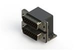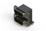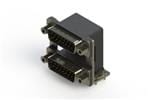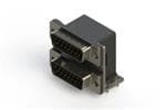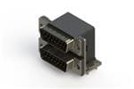 661 SERIES RIGHT ANGLE DUAL D-SUB PLUG OVER PLUG CONNECTOR EACH WITH 15 PIN TYPE CONTACTS THAT HAVE 30 GOLD PLATING. THE CONTACTS ARE STANDARD DUAL PORT 90 BEND PCB TERMINATION. THE BOARD MOUNTING FEATURES ARE 2 PRONG BOARDLOCKS,